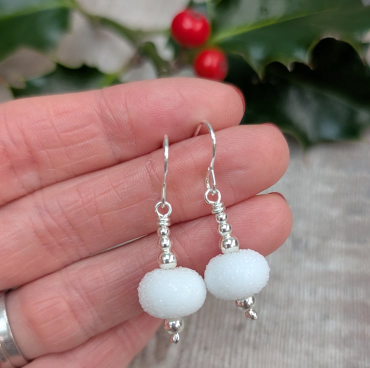 These Silver Christmas Snowball Lampwork Glass Earrings bring a soft winter feel to your festive jewellery. Each bead is handmade in frosted white glass, giving it the look and texture of a tiny snowball. The beads are finished with polished sterling silver details and hang from handmade silver ear wires.