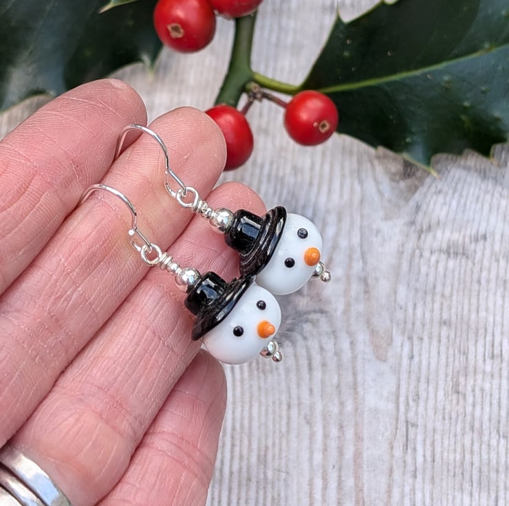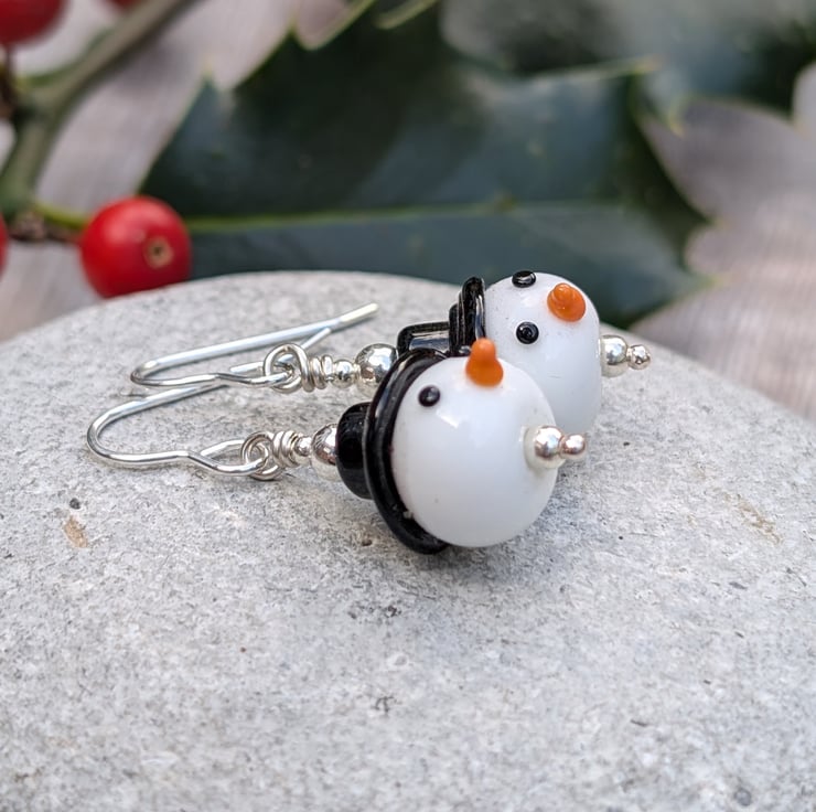 These Silver Christmas Snowman Lampwork Glass Earrings add a cheerful winter touch to your jewellery collection. Each snowman bead is handmade in glass, featuring a bright white body, tiny black eyes, a little orange carrot nose, and a glossy black hat. Sterling silver details complete the design, and the earrings hang from handmade silver ear wires.