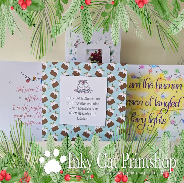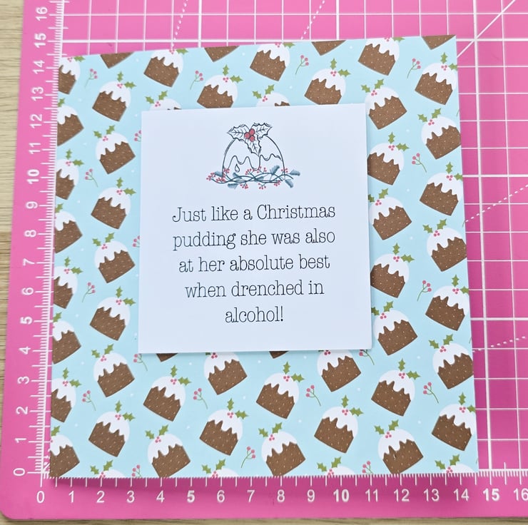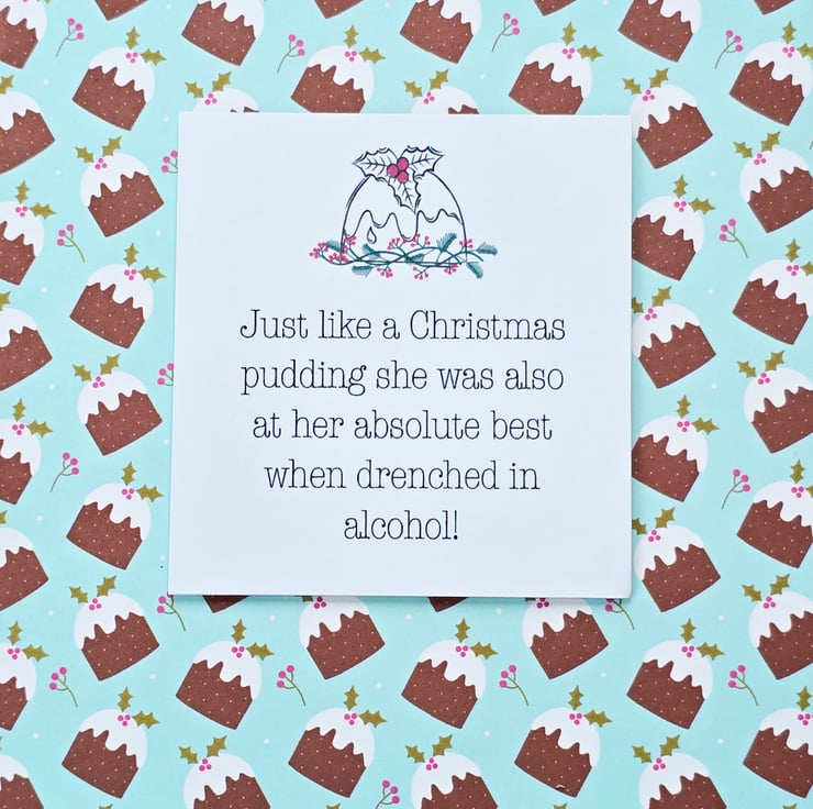 The front of the card features the hilarious quote: "Just like a Christmas pudding, she was also at her absolute best when drenched in alcohol." mounted onto the christmas pudding pattern.