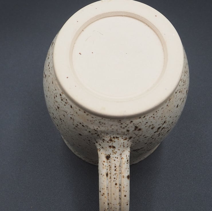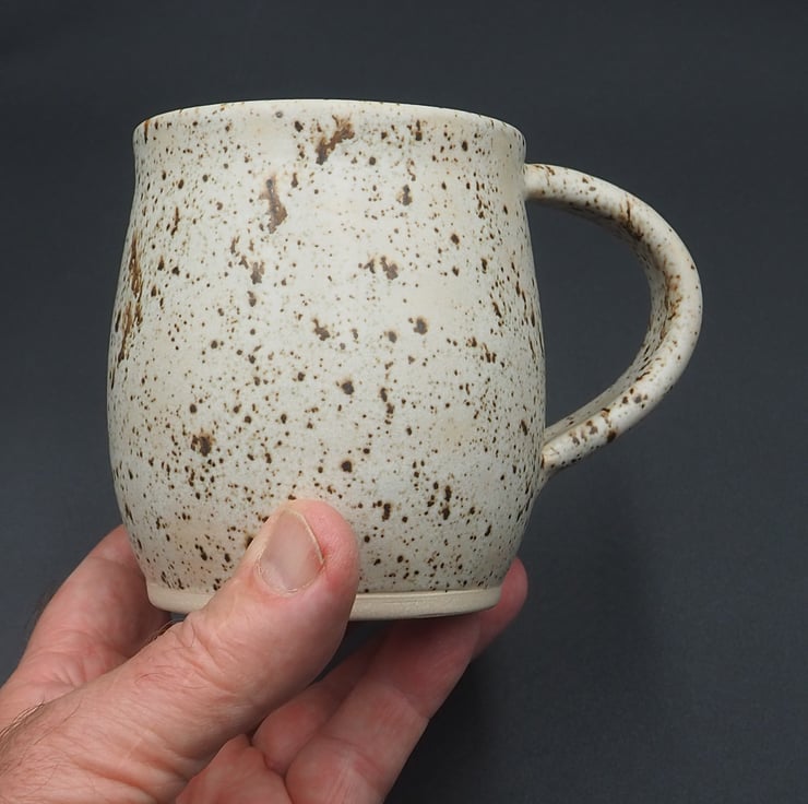 Large coffee, tea or hot chocolate mug. Hand thrown on my potters wheel and glazed in a multi-coloured brown flecked cream satin glaze. Inside glazed in glossy white.