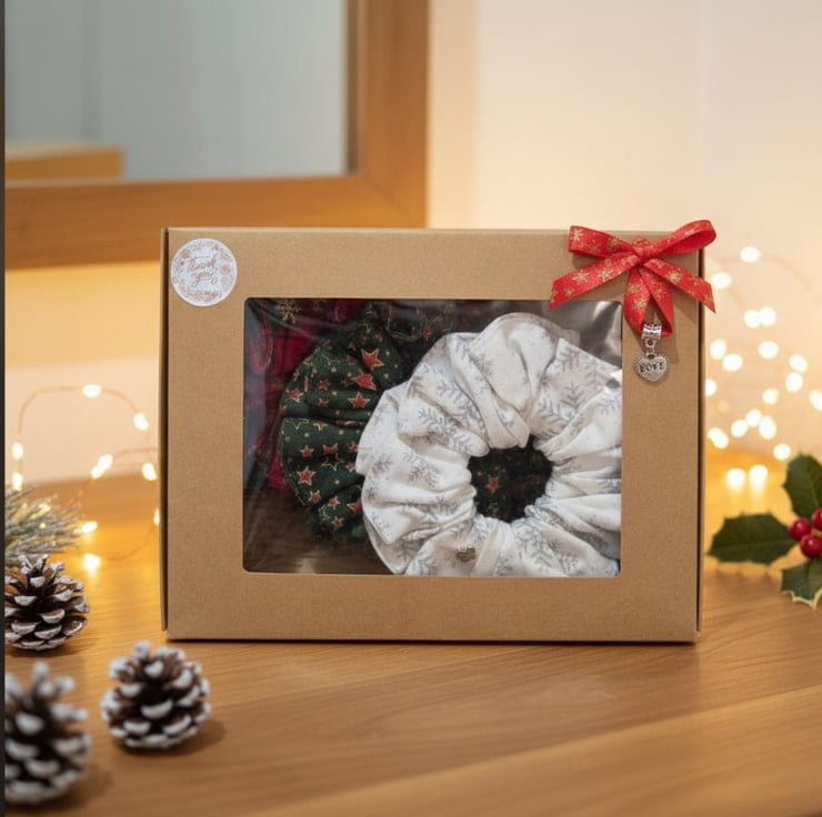Inspired by the warmth of Christmas lights and festive colours, this scrunchie set was created to bring sparkle, comfort and joy to the holiday season. Each piece is handmade with care and love in the United Kingdom, making it a thoughtful gift or a stylish treat for yourself.