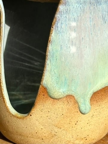This stoneware wax warmer features a flowing glaze in soft blues and greens with gentle hints of purple, reminiscent of coastal waters and heather-covered hills. The sandy base adds a natural, earthy finish.