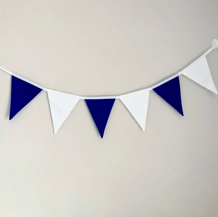 Blue and white cotton double sided bunting. 1 meter plus ties.