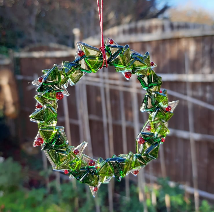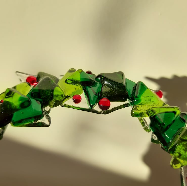 A fused glass holly wreath made with four different shades of green glass with some bright red berries. This wreath is made up of 3 layers of glass, each layer being arranged on top of the one below and fused together in my kiln. It is made of many individual pieces of glass all hand cut, cleaned and arranged. The berries I pre made before adding to the wreath. A lot of time and love goes into each piece.