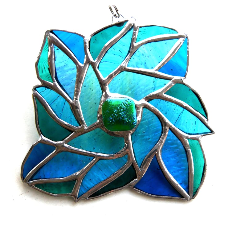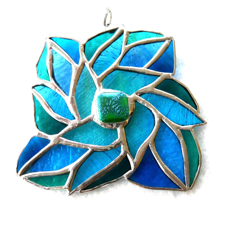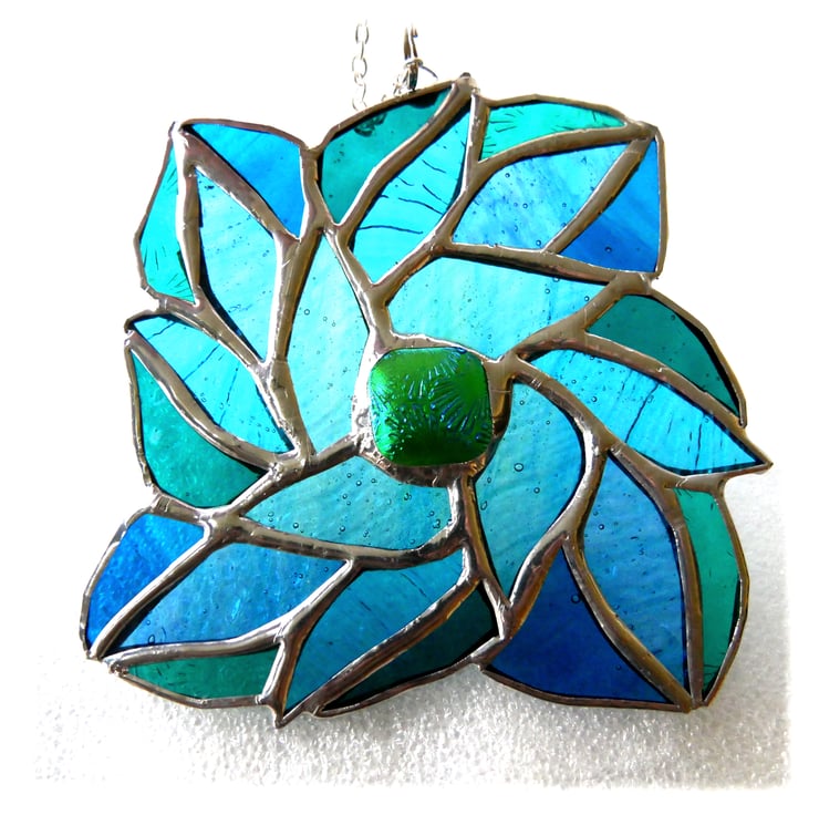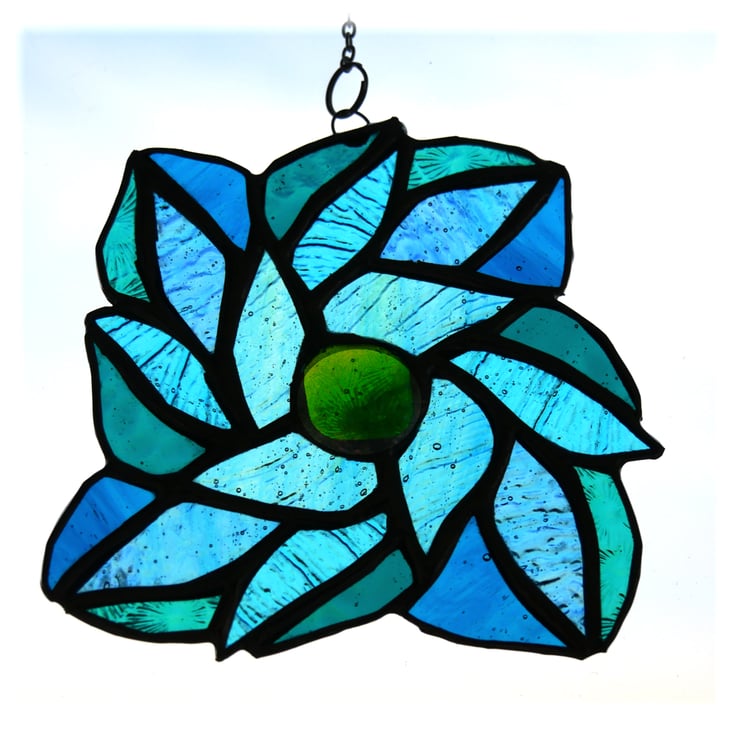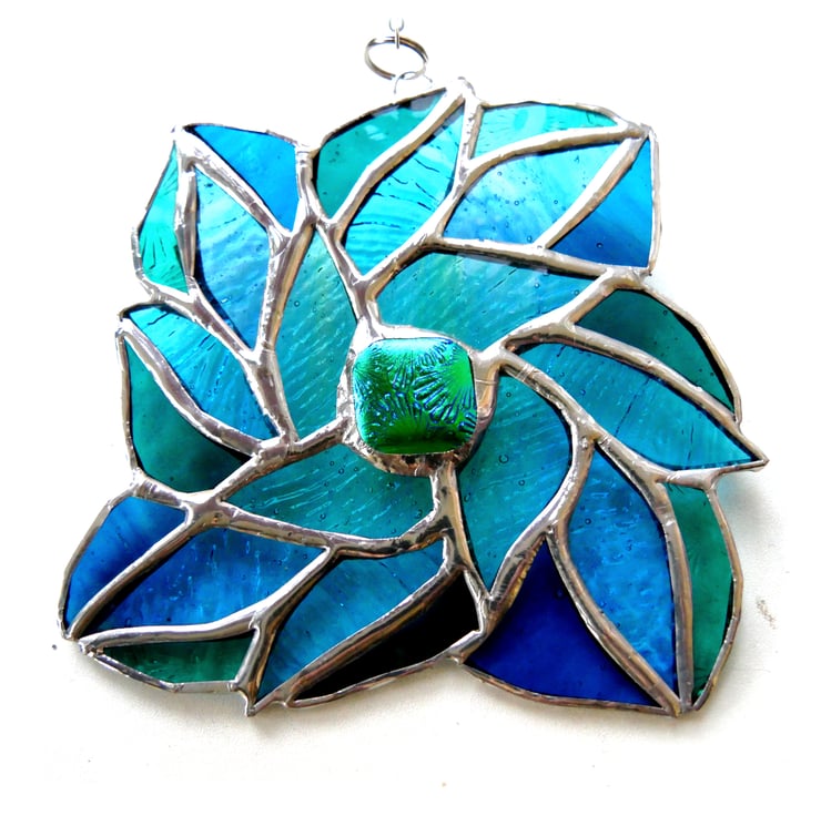 The nugget is green, the petals cut from 6 different types and shades of turquoise and teal glass with lots of texture and movement.