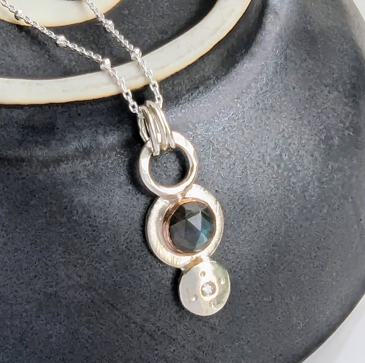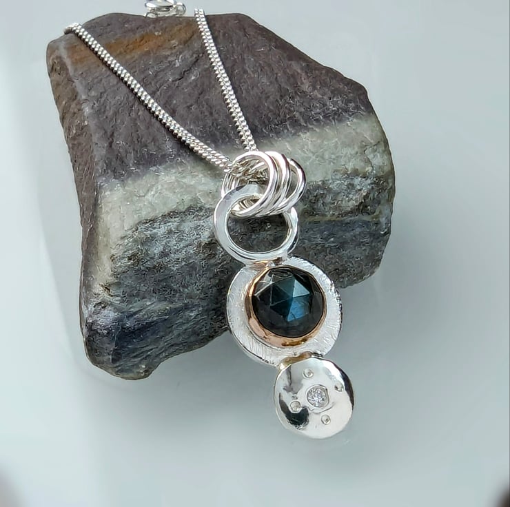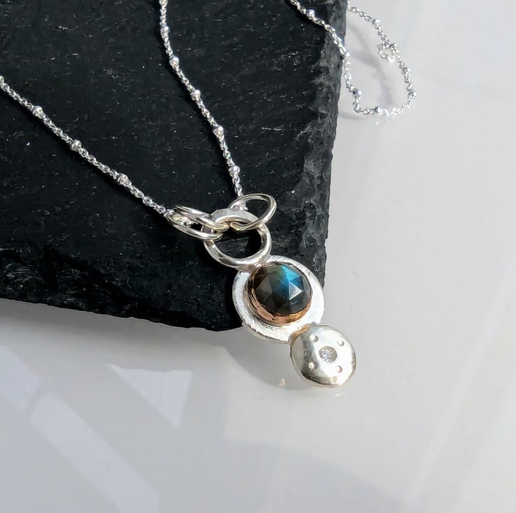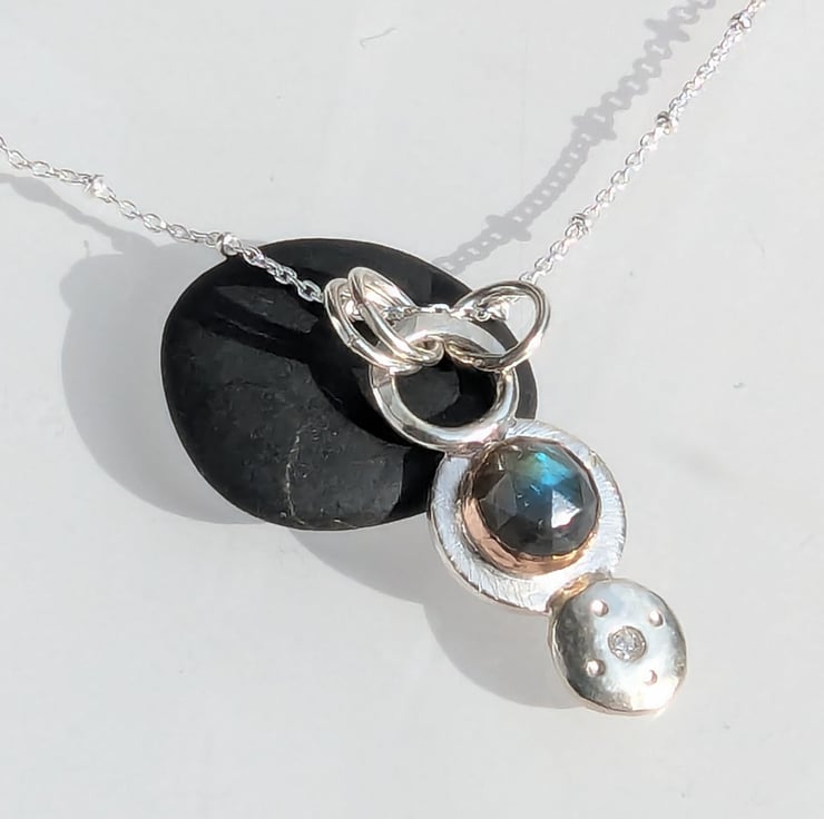 Sterling Silver and 9 carat Rose Gold Labradorite and Diamond pendant.