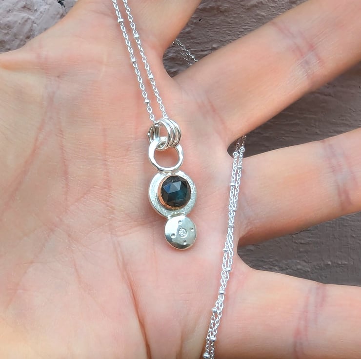 Hammered and Forged textured pendant, featuring a 8 mm rose cut labradorite set into a 9 carat rose gold bezel on a scratched textured disc with a 2 mm diamond set below.