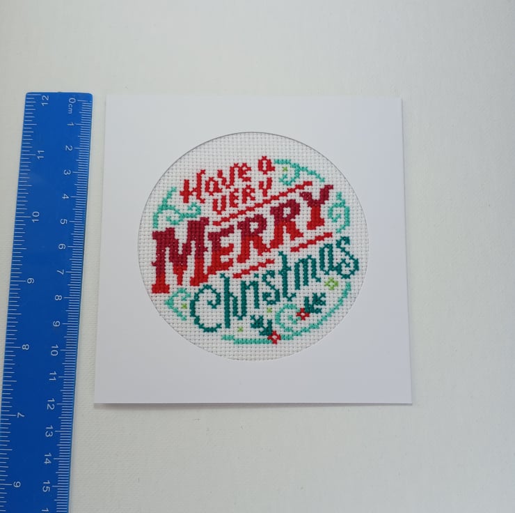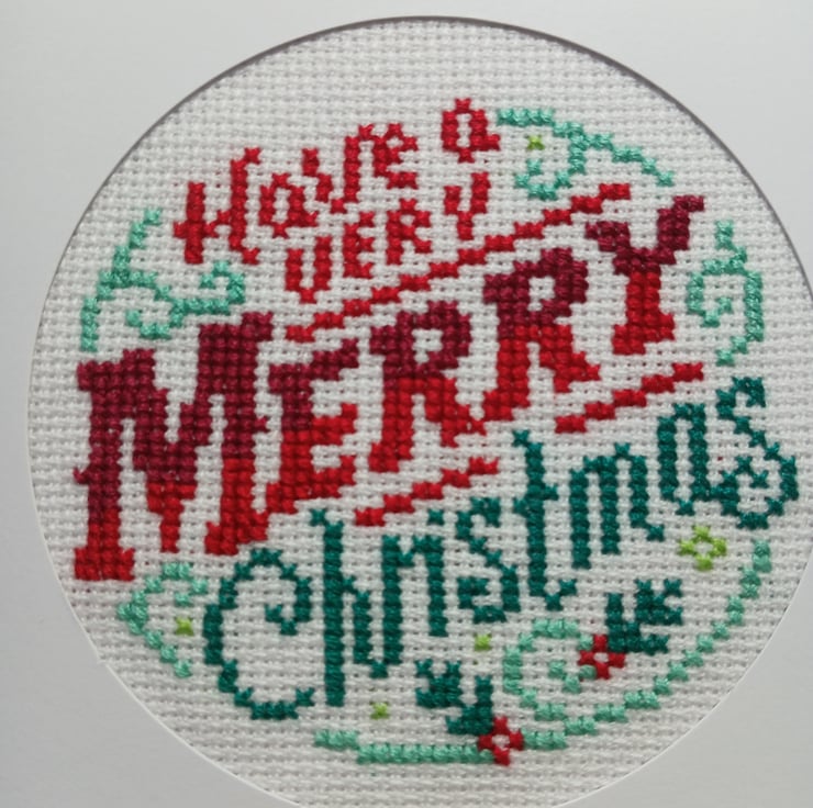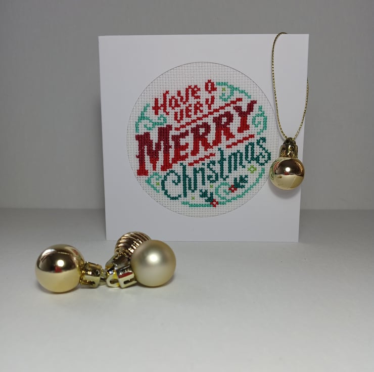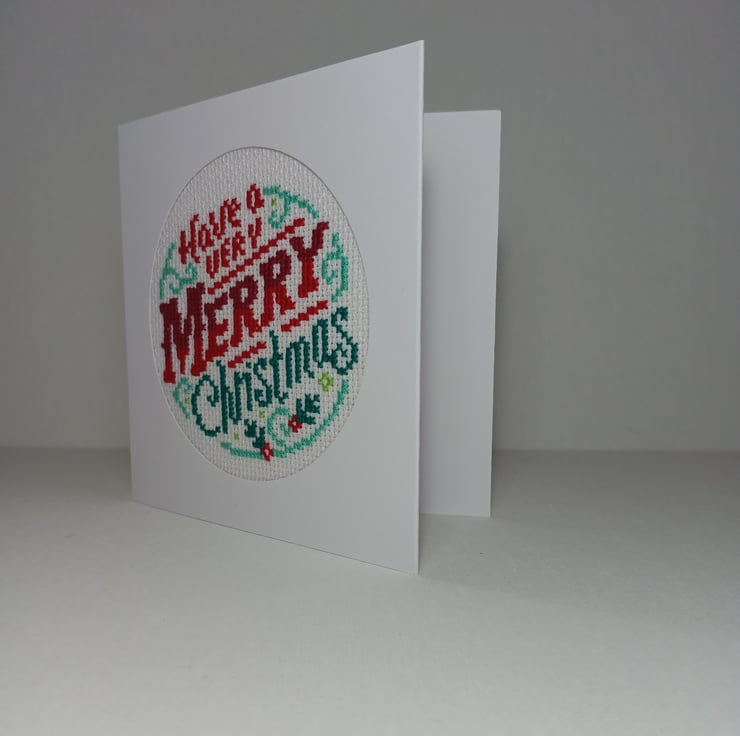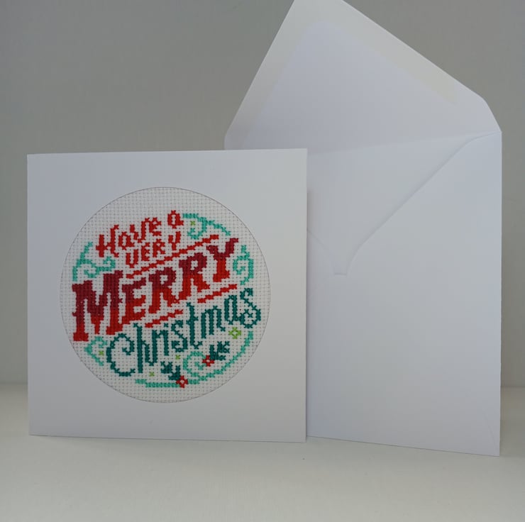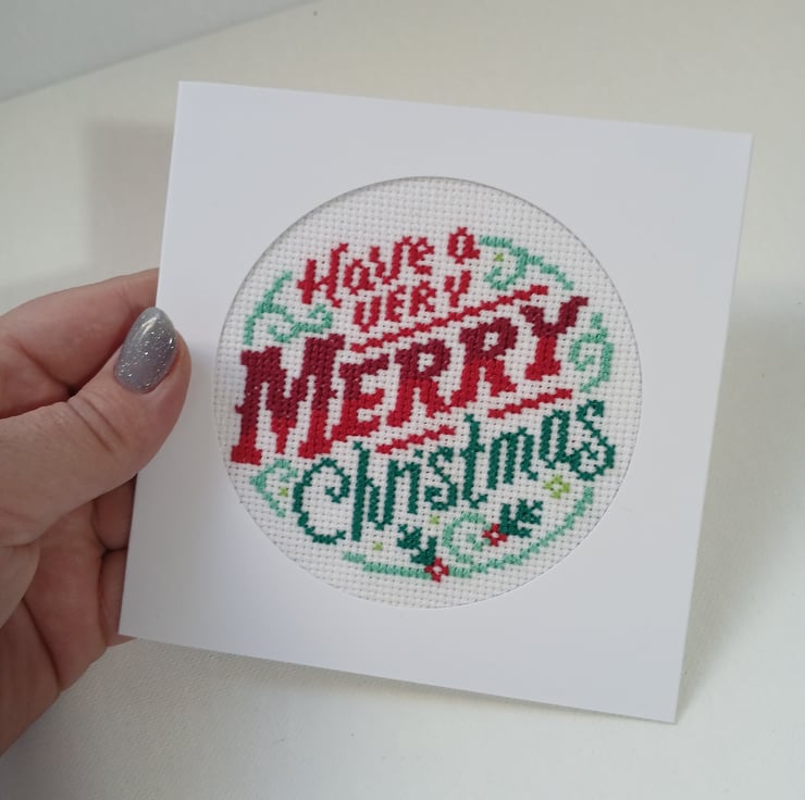 This handmade Christmas card features a circular cross-stitch design with the message “Have a Very Merry Christmas”, surrounded by holly leaves, berries, and delicate swirls.