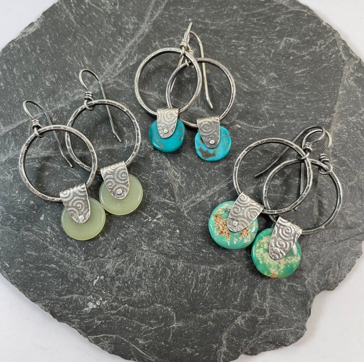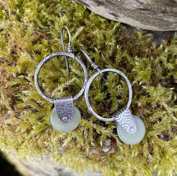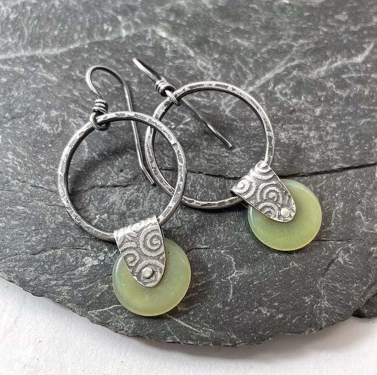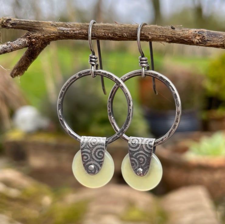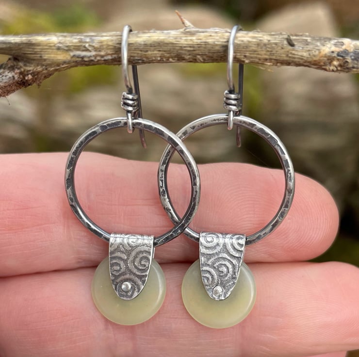 These earrings are big silver rings with pale yellow stone dangles. The silver holding the stones has been impressed with a spiral design. They hang from handmade hooks.