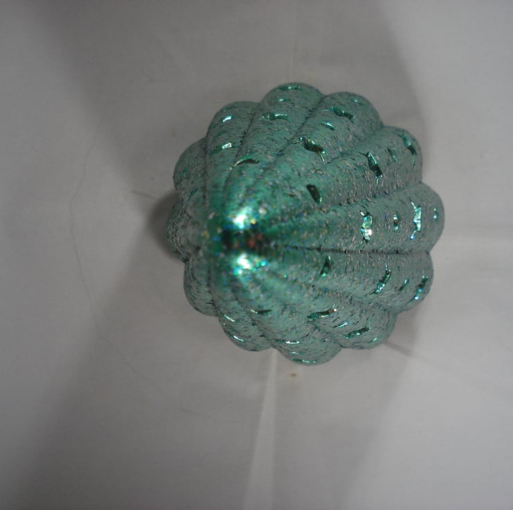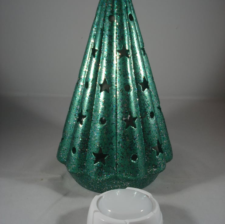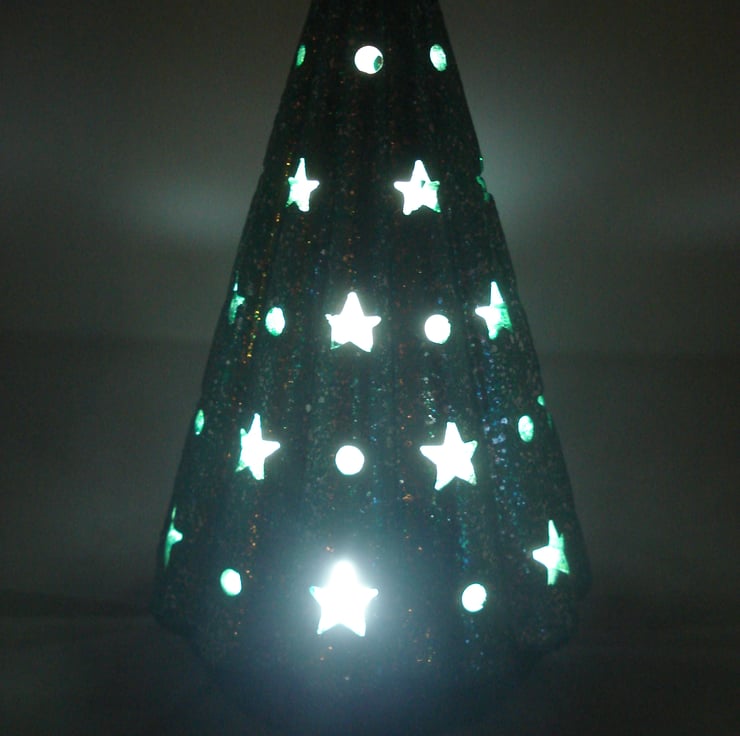 I have for sale a ceramic Christmas decoration, which was hand painted by myself. It is a green glittery Christmas tree, with small circles and stars, cut out all over it. The tree is hollow and included in the sale, is a free battery operated LED push light, which the tree stands over the top. This would make a lovely addition to anyone's Christmas decorations, or perhaps given as a gift,