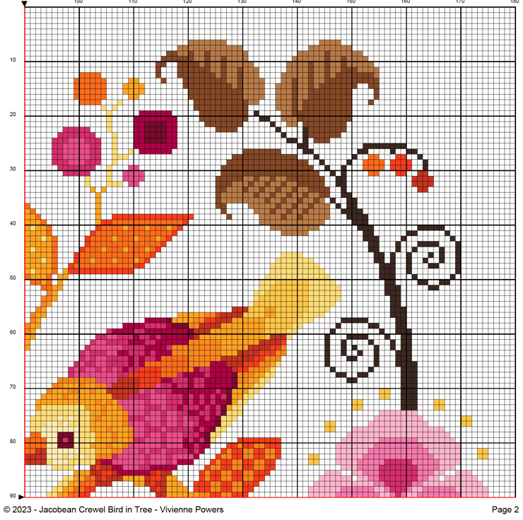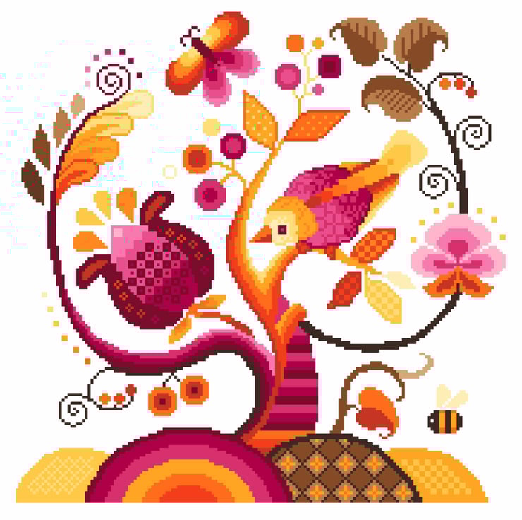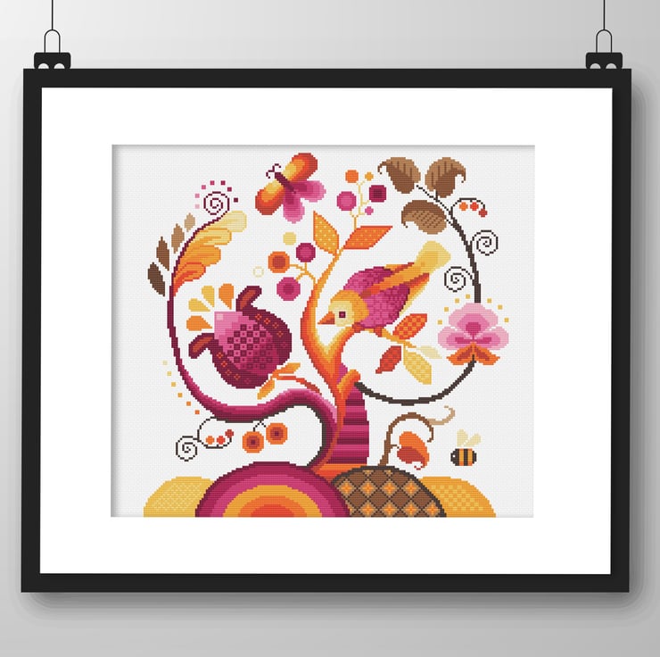 Cross Stitch Pattern traditional Jacobean Crewel Embroidery style Autumn Fall tree of life, stylised flowers, song bird, bumble bee and butterfly in meadow sampler with a few modern touches and colours. This would make an ideal cushion by Vivsters PDF counted chart Orange/ Pink/ Yellow Fall colour way 280B