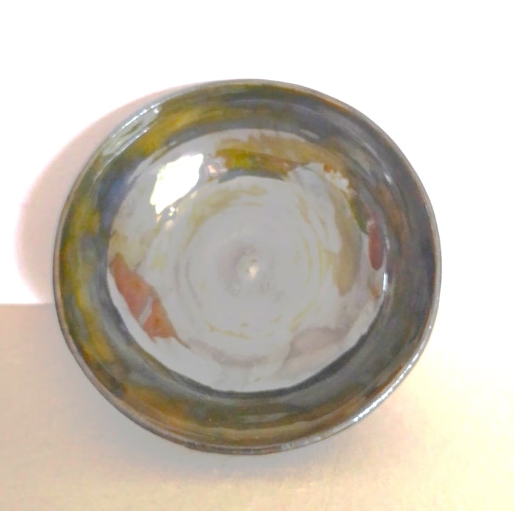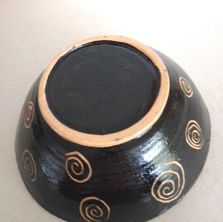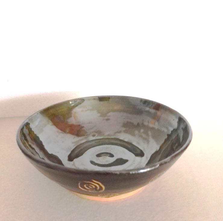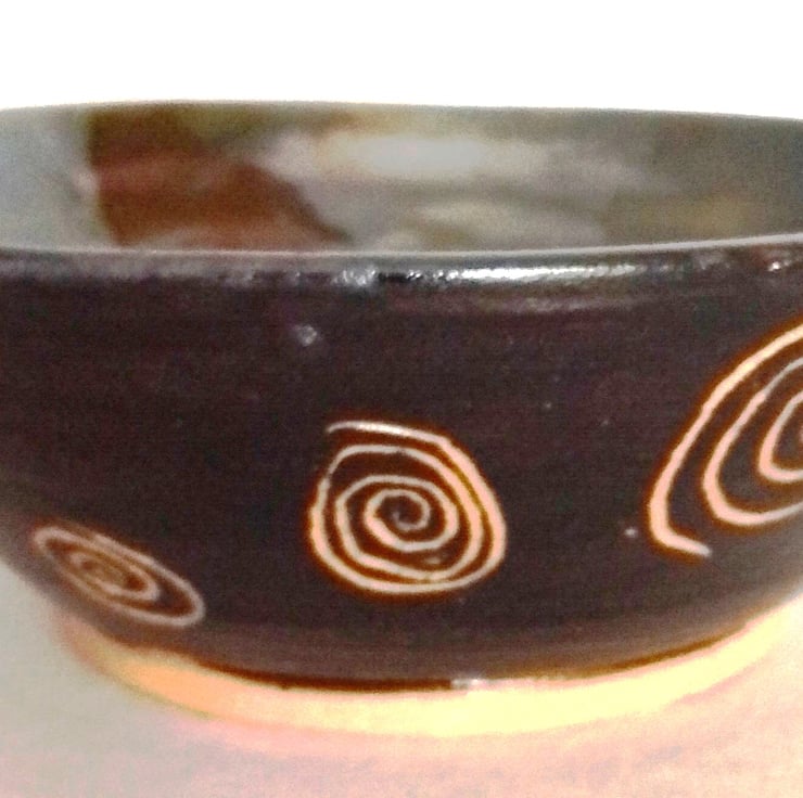 I was inspired by "scraffito" pottery I had seen. This method involves carving through to the clay to reveal a pattern. The lustre idea was to compliment the dark coffee brown outer colored glaze.