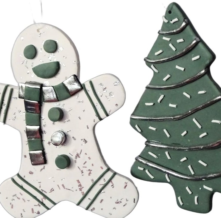 Each set includes four decorations: two Christmas trees and two gingerbread figures — perfect for gifting, decorating your tree, or adding a modern handmade touch to your festive home.