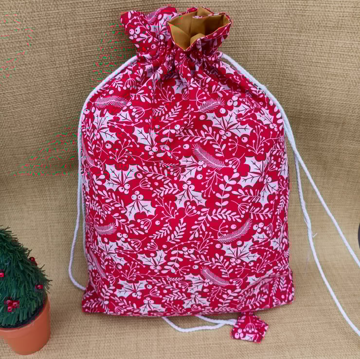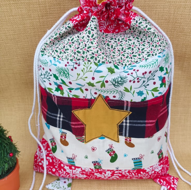 Christmas drawstring bag lined and adorned with a star on front of bag. One of a kind in colour and fabric choice.