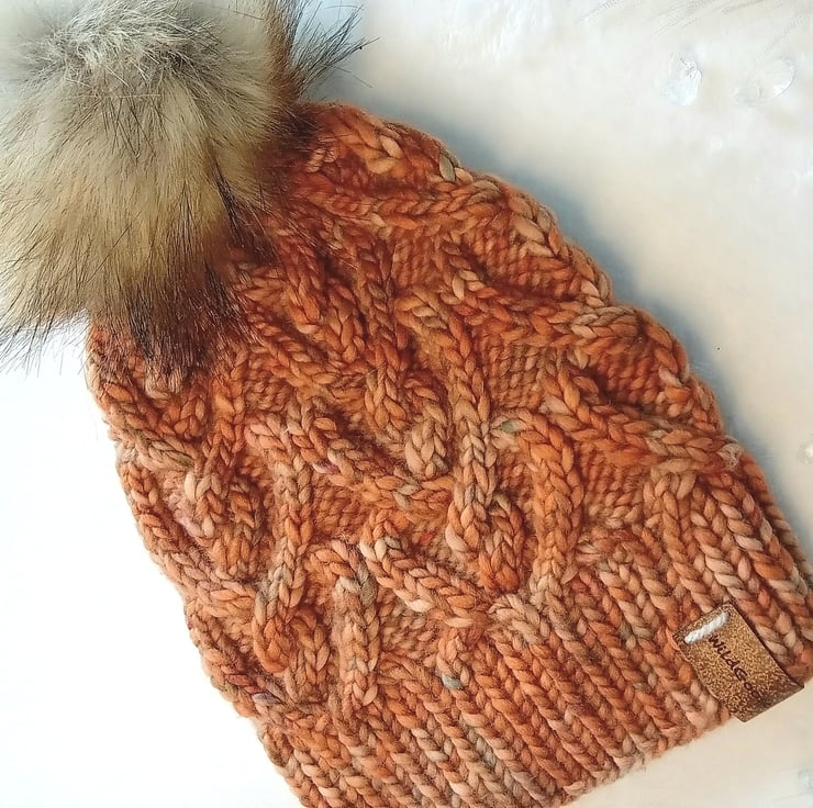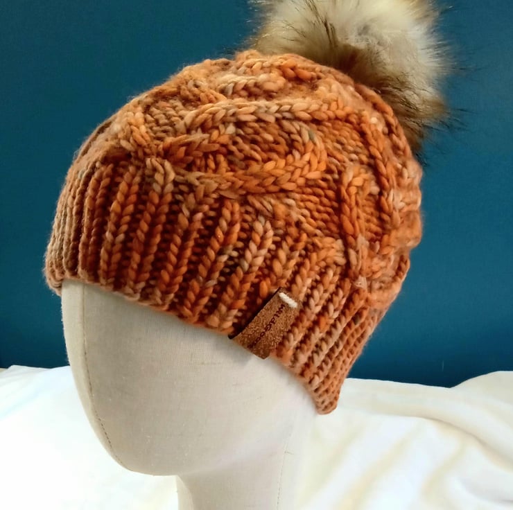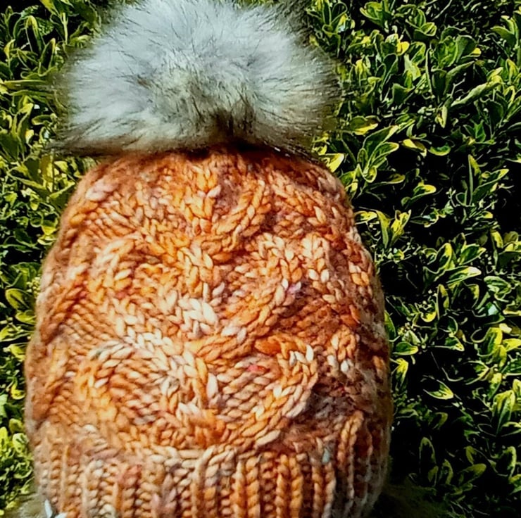 This hat is in a lovely shaded orange and features an entwined heart cable design It is topped with an optional large, good quality faux fur pompom in shades of grey and brown with dark tips. You can also remove the pom, as the hat looks great without it. Just select the appropriate option.