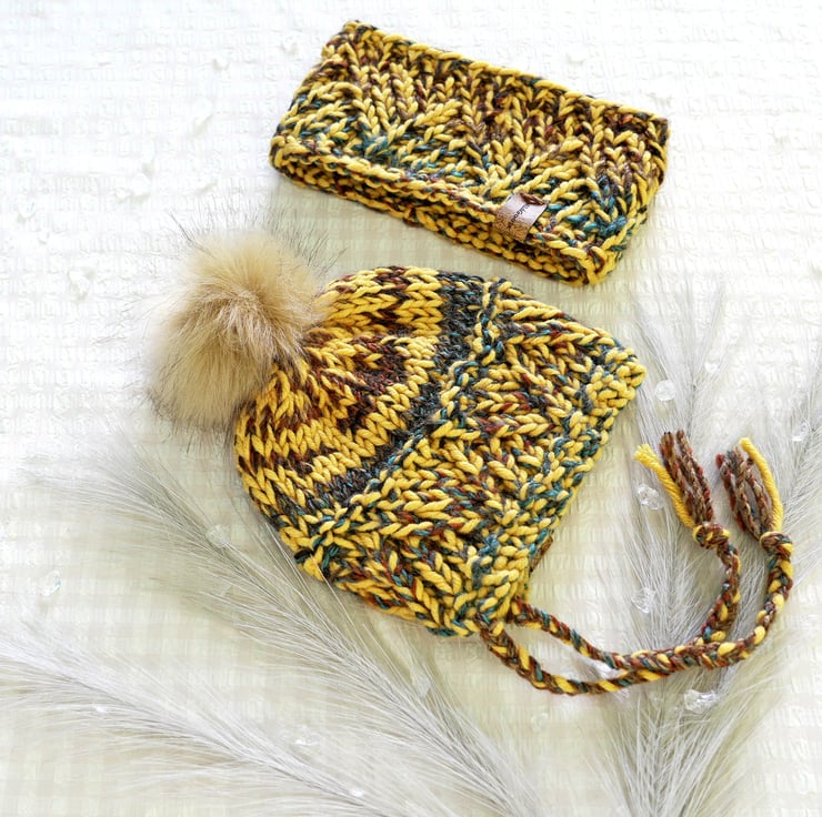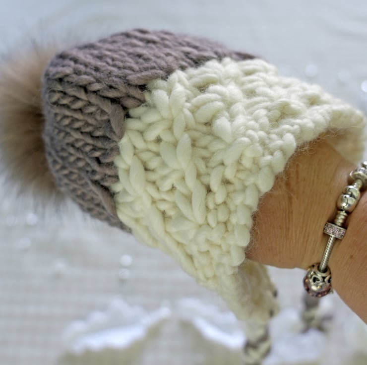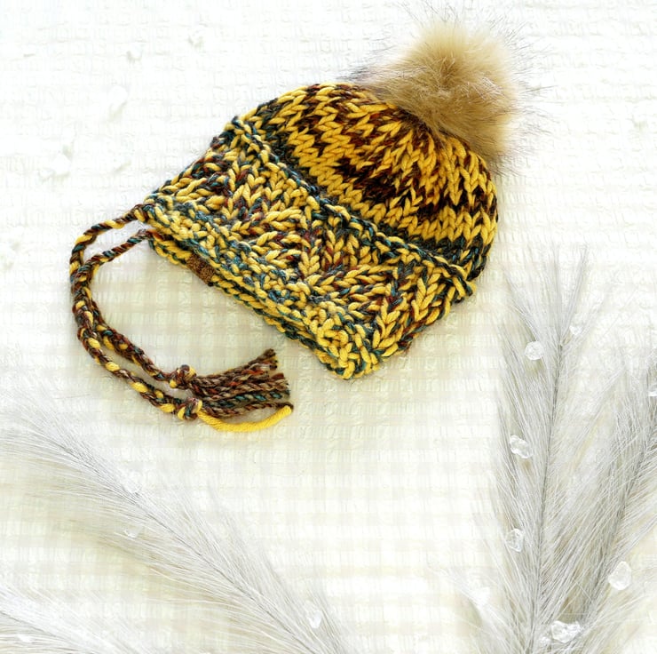 It has a geometric textured pattern around the split brim and is finished with two plats or braids at the front edges and an optional faux fur pompom in honey beige with dark tips, that is removable. But you prefer it without just select the appropriate option.