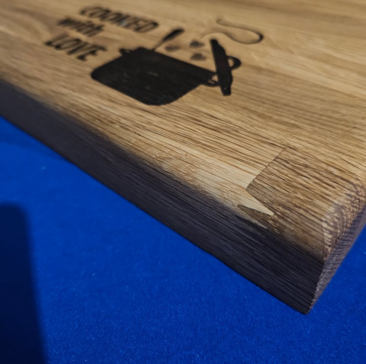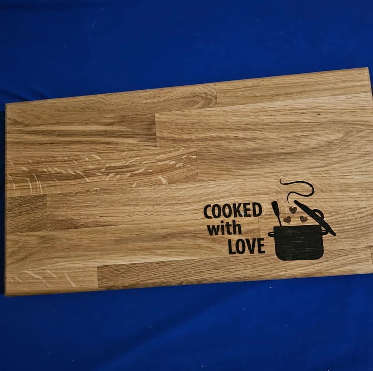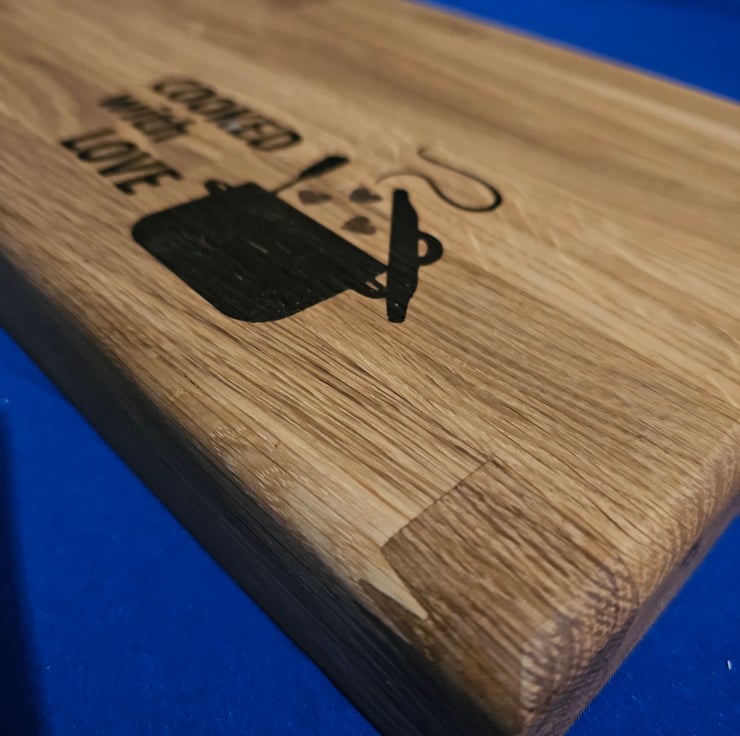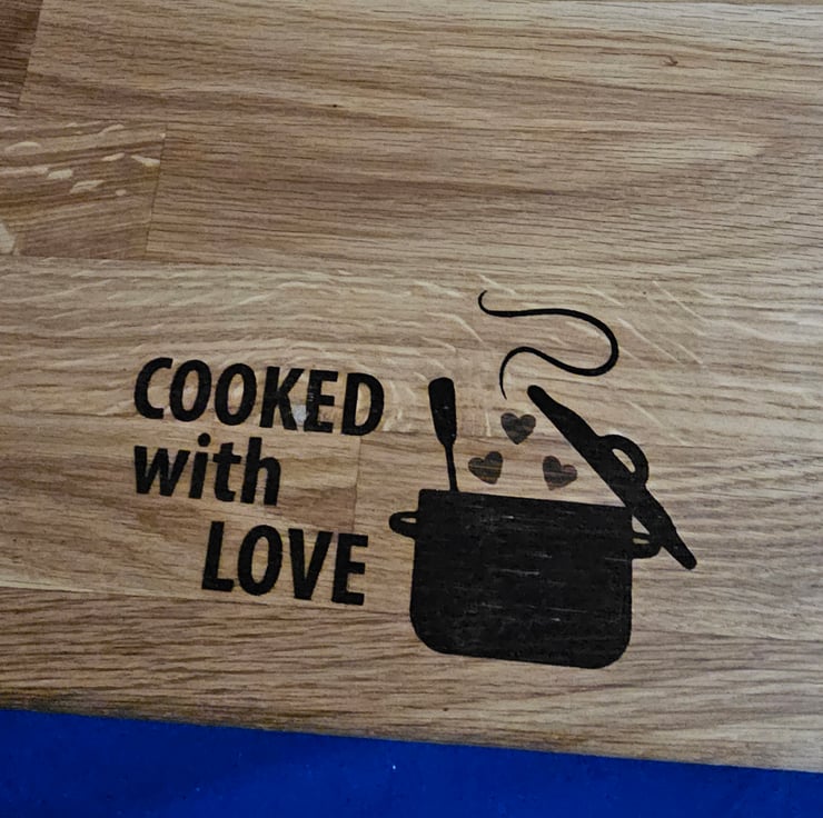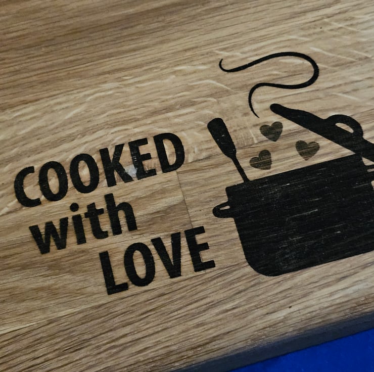 Solid oak chunky chopping board with laser engraved cooked with love quote and pan with hearts design.