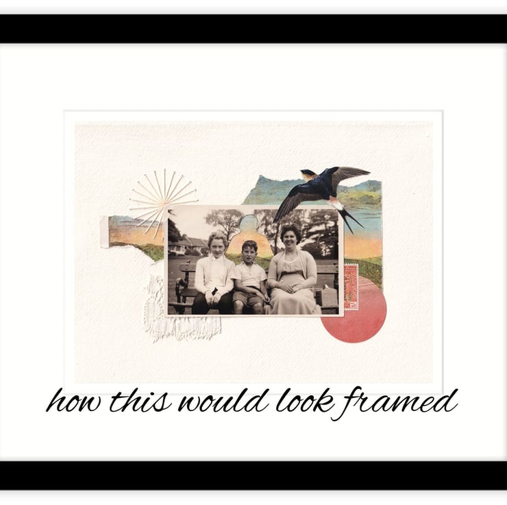 A4 handmade collage, on deckle edged handmade paper, using vintage paper, photos and ephemera, with hand embroidery and vintage lace (UNFRAMED)