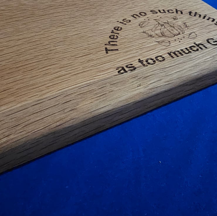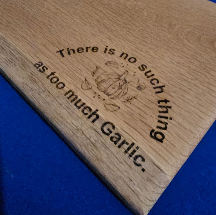 Laser engraved there is no such thing as to much garlic with garlic detail to bottom right of chopping board.