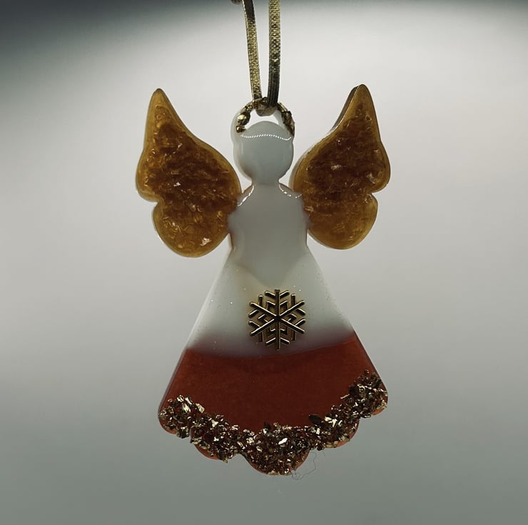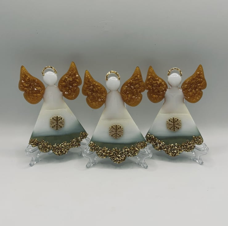 Celebrate the season with these handcrafted resin angel decorations in crisp and elegant colours of gold and white. Each angel features shimmering gold crushed glass, gold drusy wings and a delicate gold snowflake charm. These Angels are plain on the back, but if you want ones with meaningful words like Peace, Love, Hope or Joy in elegant gold vinyl checkout my other Angel listings. Or if you would like to add your own word/name, then see below.
