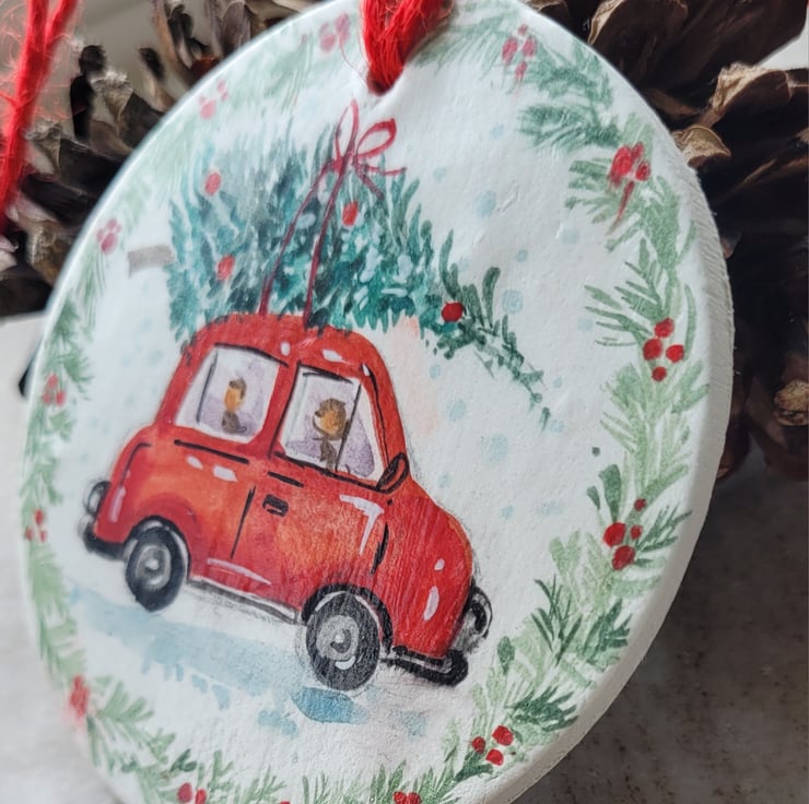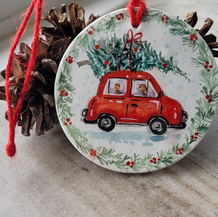 hand painted christmas ornament, clay decoration, red car, snow scene,