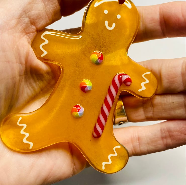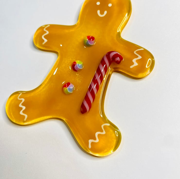 Handmade fused glass gingerbread man Xmas Decoration .