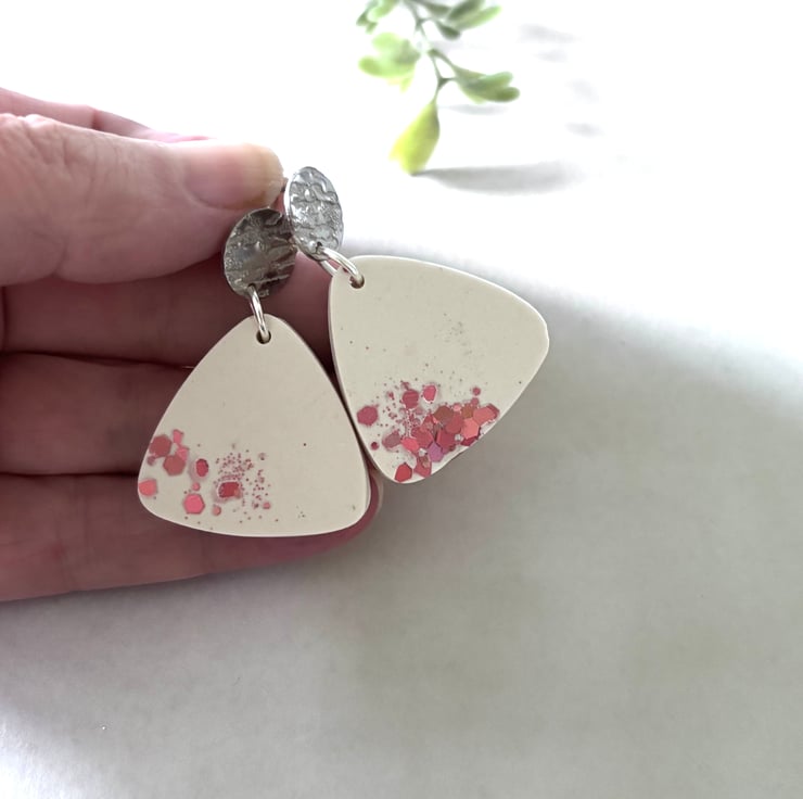 Here are our unique large Triangular Jesmonite and Red Glitter Earrings! Handcrafted from durable Jesmonite, these stunning earrings feature a bold triangular design infused with sparkling red glitter that catches the light beautifully.