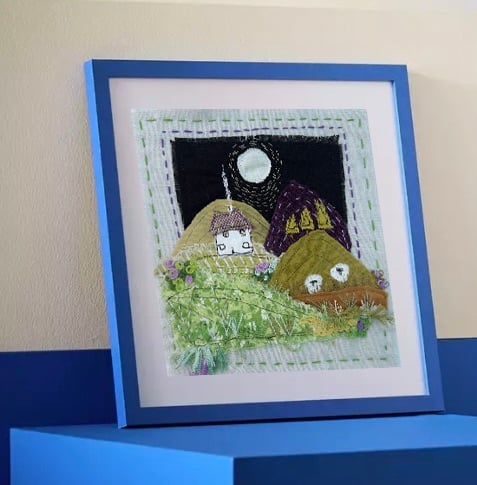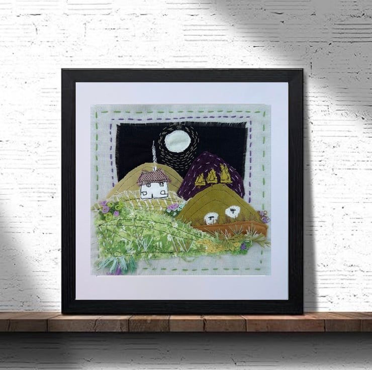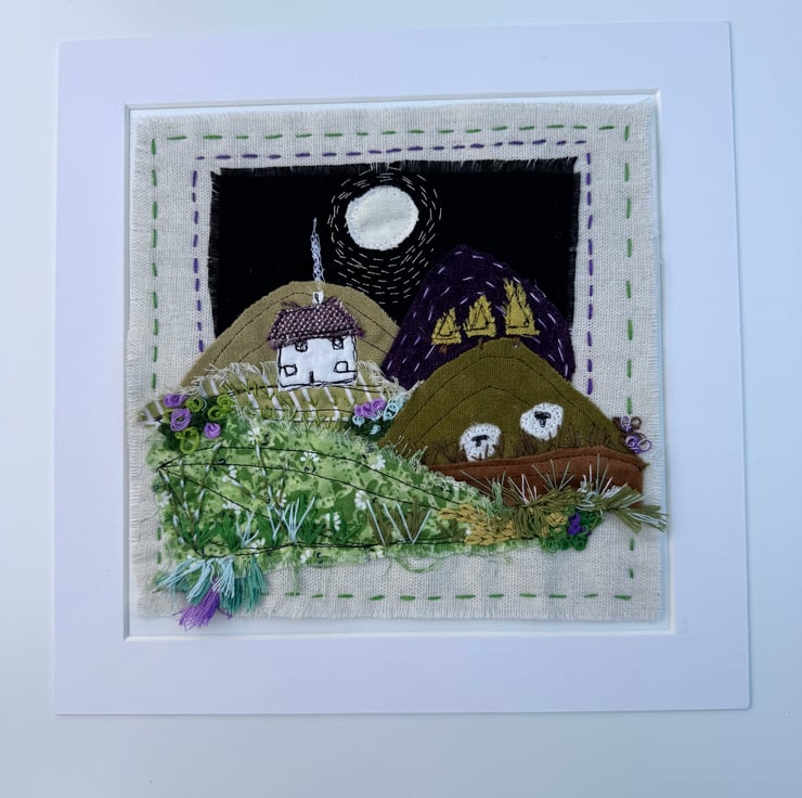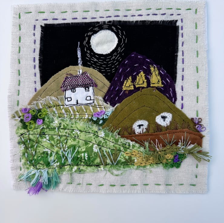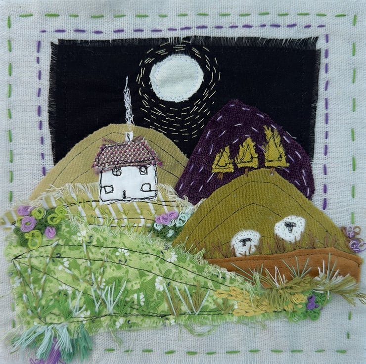 This textile artwork combines free-motion machine stitching and hand embroidery to create a nighttime landscape. A small white cottage sits nestled among rolling green and purple hills, bathed in the soft glow of a full moon. Delicate stitched details and layered fabrics bring rich texture and depth to the scene.