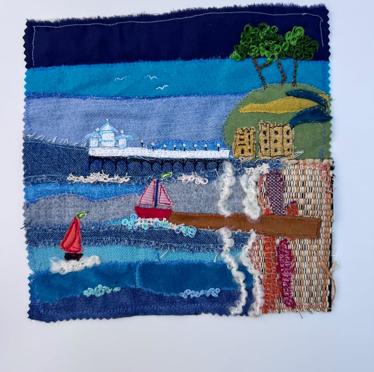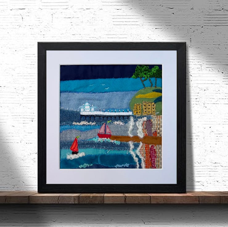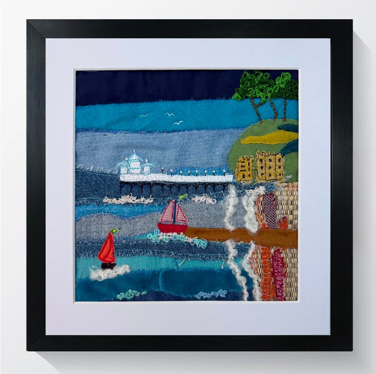 Bring Clevedon’s iconic pier into your home with this unique piece of textile art. Created using a combination of free motion sewing and hand embroidery, this artwork captures the seaside scene with beautiful texture and colour — from the stitched waves and sailboats to the intricate details of the pier and hillside.