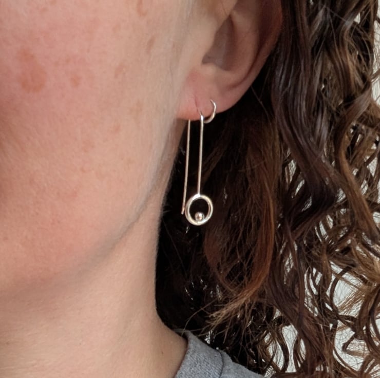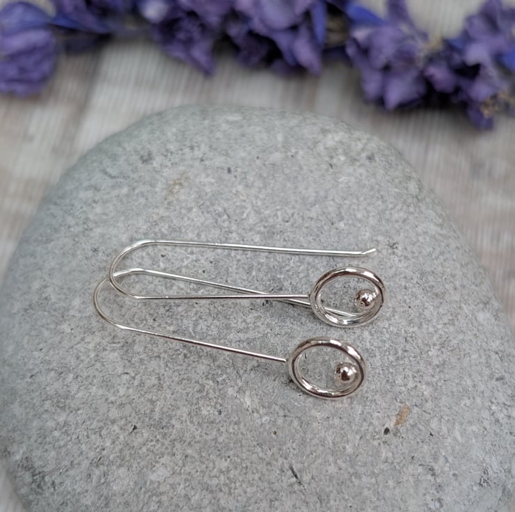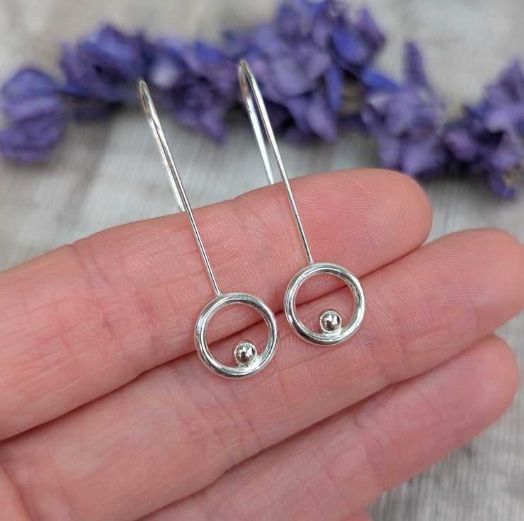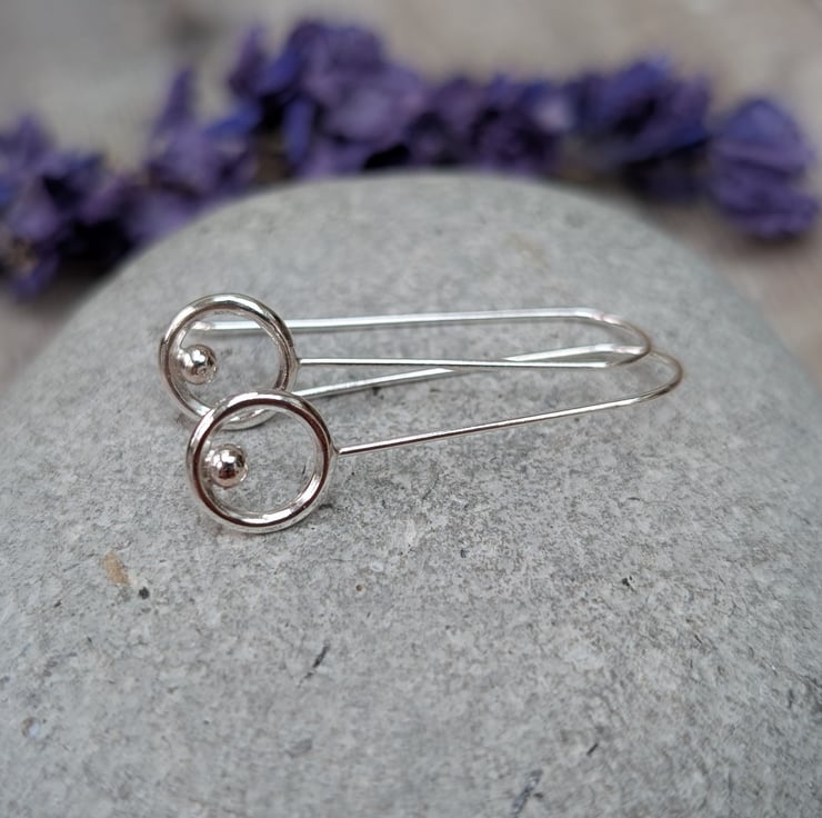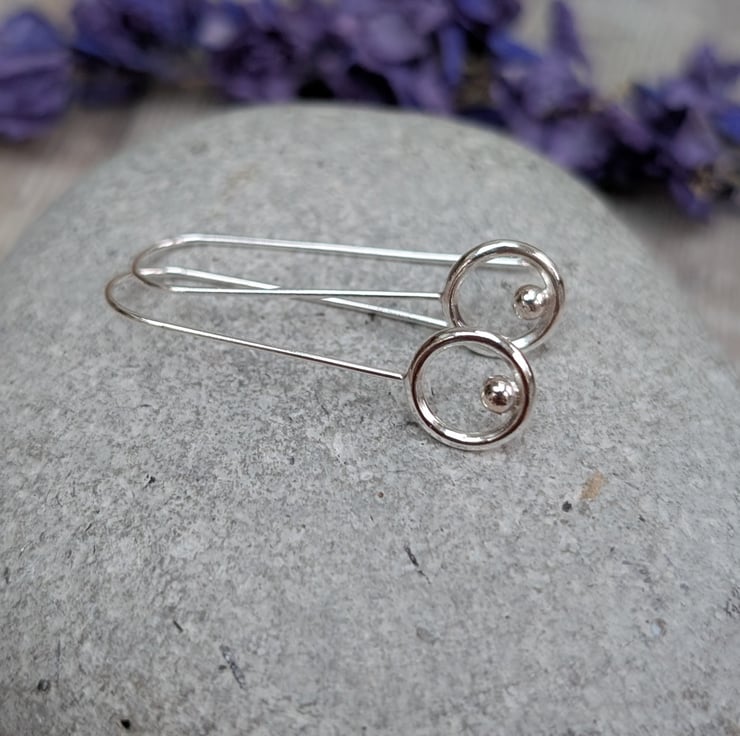 These silver circle and dot long earrings are a simple, modern design with a soft, handmade feel. Each earring features a polished silver circle with a tiny dot nestled at the base, creating a clean and understated focal point. The long ear wire gives them a gentle, elegant drop that frames the face beautifully and feels light and easy to wear.