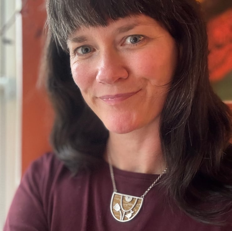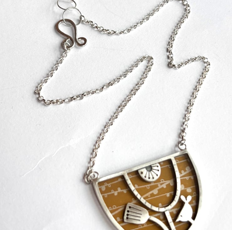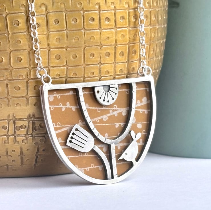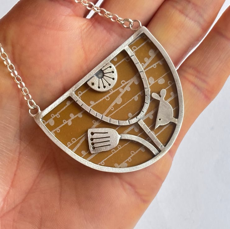 Make a statement with this lovely bib necklace hand crafted from sterling silver and anodised aluminium . The framework is made from sterling silver square wire and is inspired by mid century design. The background is made from anodised aluminium with a pattern designed by me inspired by the woodland. There is a little bird and seed head and the piece has been oxidised and rubbed back to a satin finish.