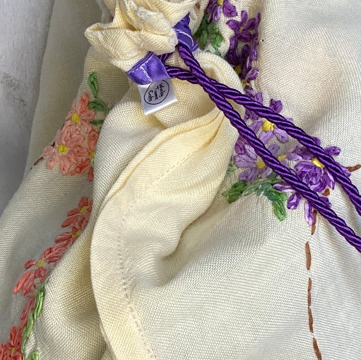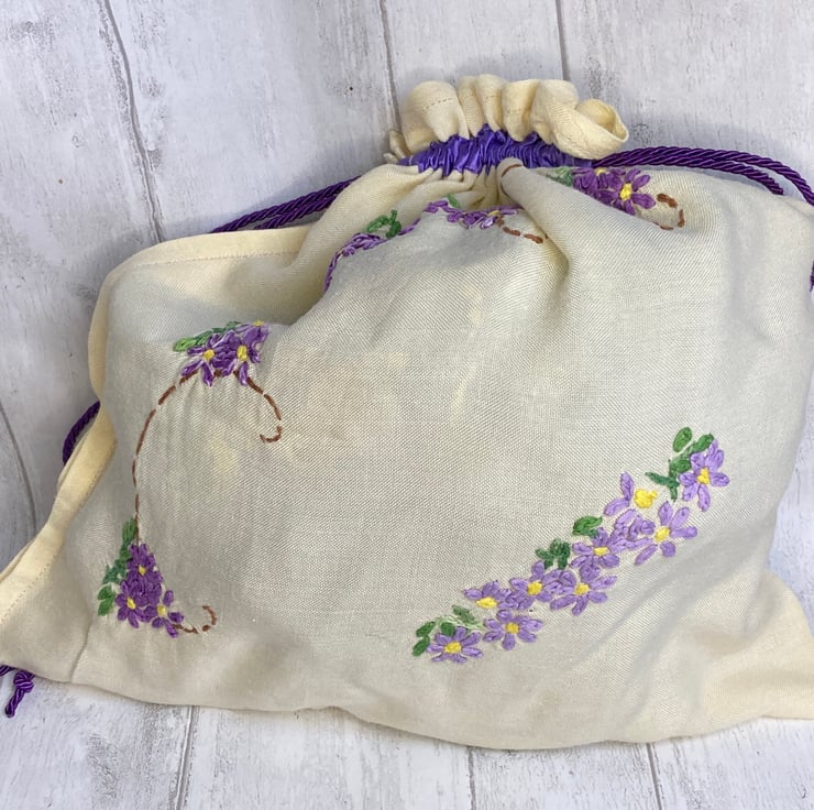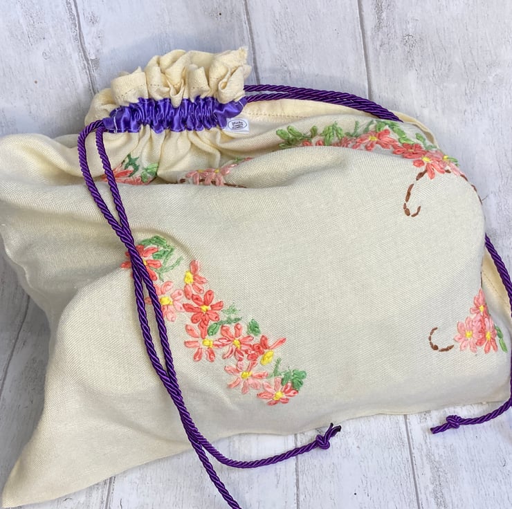This lovely bag is made from a pale yellow vintage embroidered tablecloth, decorated with pastel-coloured floral embroidery. The bag measures 42 x 42cm. It has had a length of lilac satin bias binding added through which a purple drawstring cord runs. The floral embroidery is in shades of purple on one side and peach on the other. It is perfect to keep your dirty laundry secure and separate from the clean clothes in your suitcase or you may think of another, completely different way of using it.