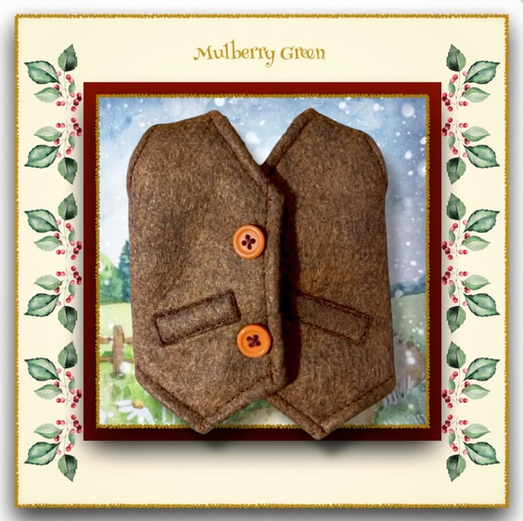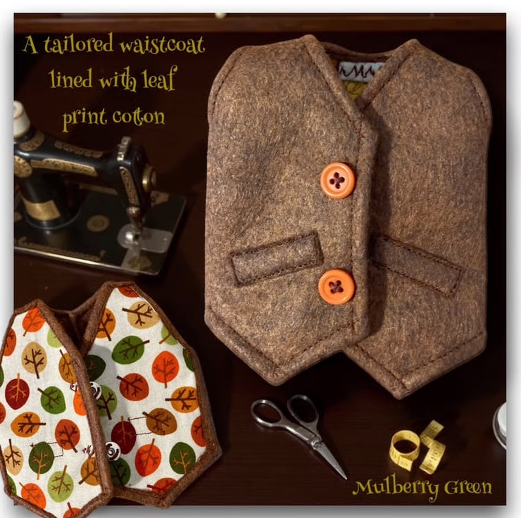 A lovely classic brindle brown tailored felt waistcoat, lined with pure cotton in an Autumn leaf print, to fit the Mulberry Green characters. The waistcoat is made from best quality wool felt and is finished off with two little buttons with poppers underneath.