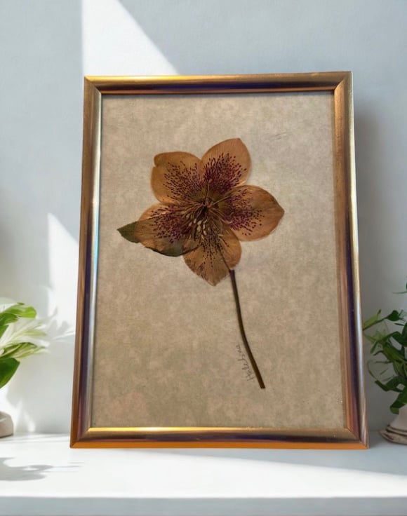 This is a one of a kind handcrafted art piece using pressed hellebore flower picked from my own garden, mounted on a pale green background in a gold colour frame