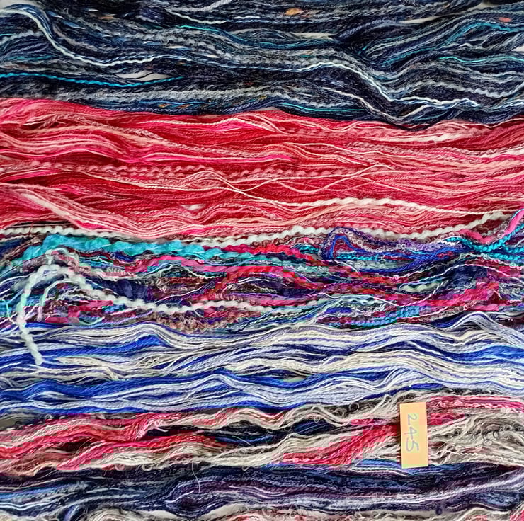 Mixed fibre composition may include lengths of natural yarns - wool, cotton, linen, wool mix, and man made yarns - acrylic, mixed fibre combinations.