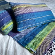 Warm reds, oranges and pinks with a hint of brilliant blue are hand woven into this 100% wool cushion cover.