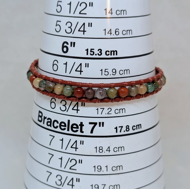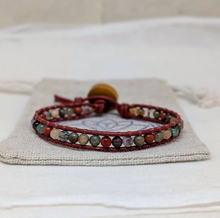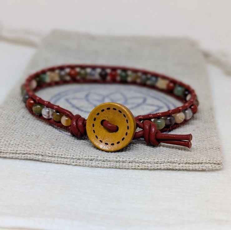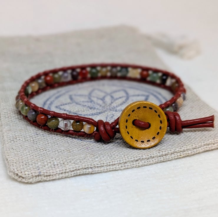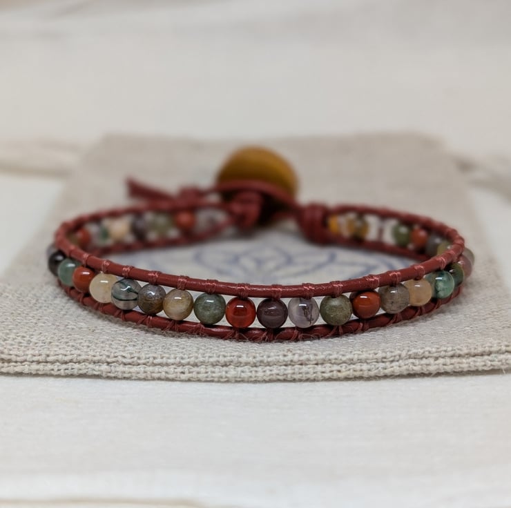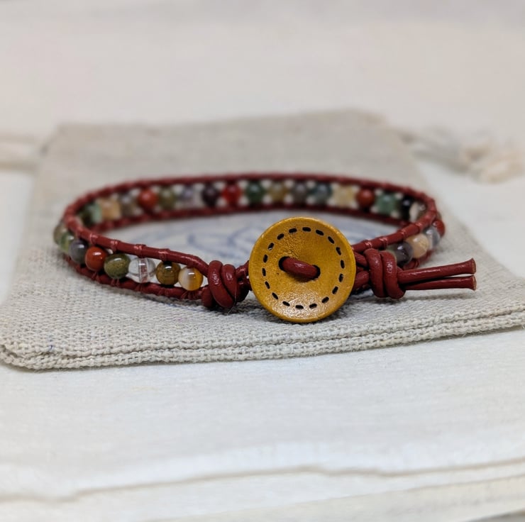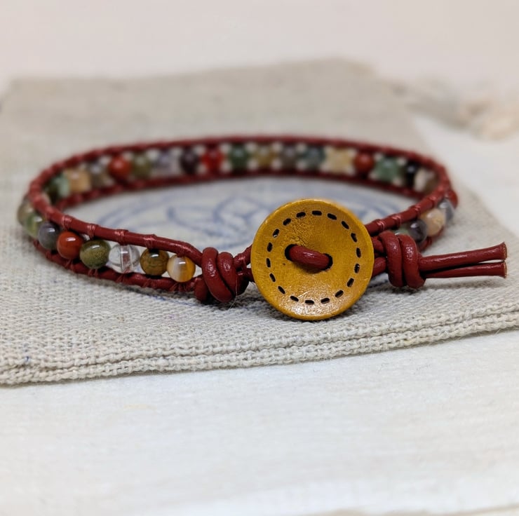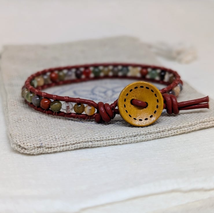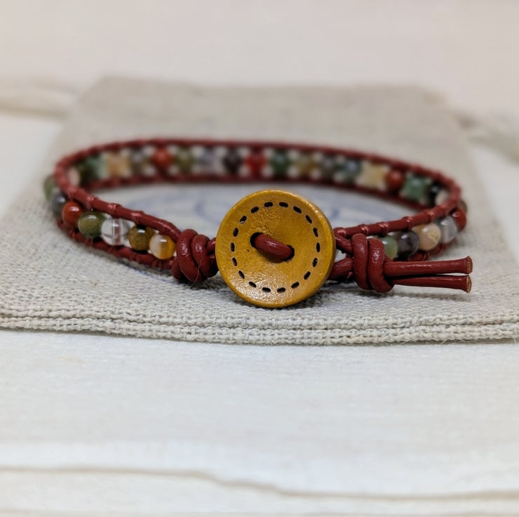 This earthy-toned bracelet blends warm autumn colours with natural textures. A mix of smooth gemstones in russet, amber and mossy hues are stitched between rust-coloured leather cord, creating a cosy, grounded feel.