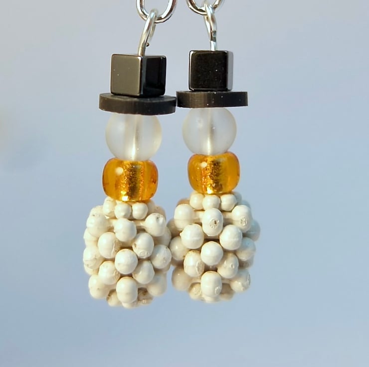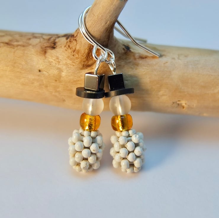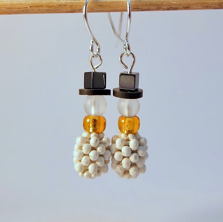Each snowman has a body made from different sized rustic white daisy spacer beads, a yellow glass seed bead for a scarf, small frosted glass head and a hat made from a polymer clay disc topped with a Hematite cube.