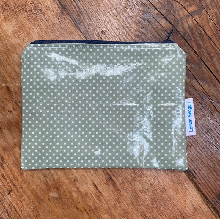 This make up bag is made from sage green oil cloth with white spots. The bag is lined with modern floral cotton fabric and a blue zip.