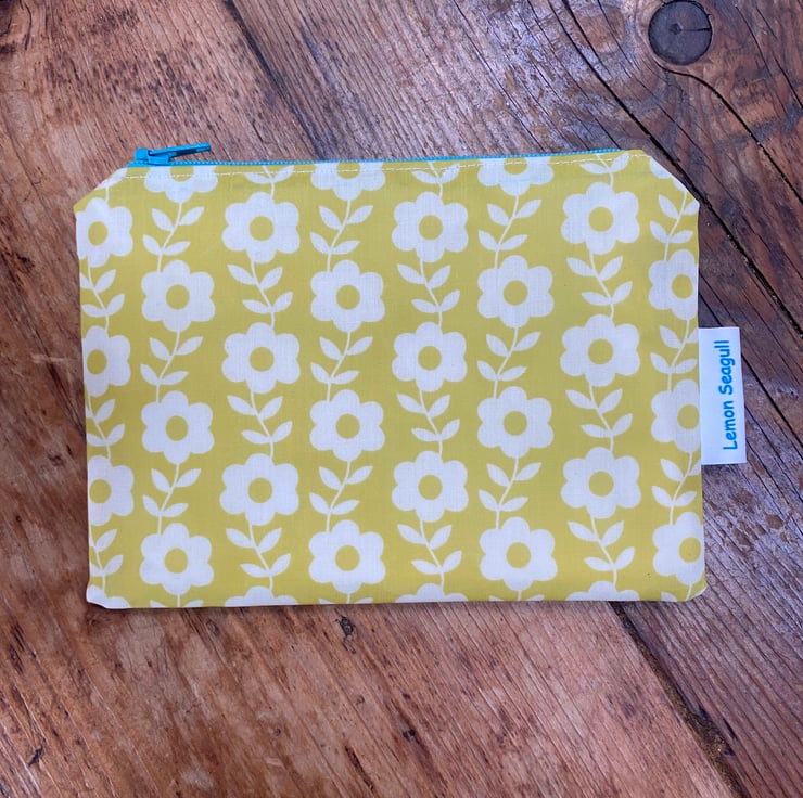 This make up bag is made from yellow oil cloth with white flowers. The bag is lined with white cotton fabric and a turquoise zip.