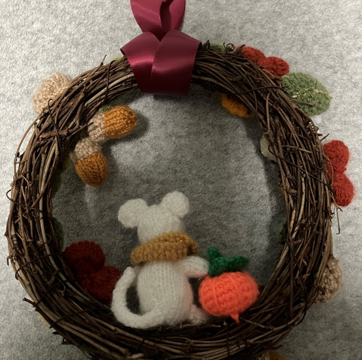 Description: The wreath is handmade using natural grape vine. The white mouse holding a pumpkin is the main character. The white mouse wears a gold woollen scarf with a lucky four-leaf clover antique tone charm. The wreath comes complete with a claret ribbon for hanging.
