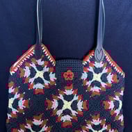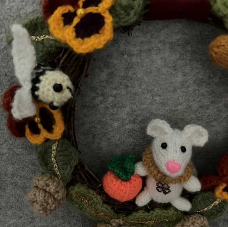 Features: The flowers are crochet pansies each has a central glass bead. The main vein of the crochet leaves has been embroidered in chain stitch with metallic thread. The acorns and pine cones have been knitted. The little crochet bee has glass beads for eyes. The bee wings are white; the bee body is in yellow and black glitter yarn.