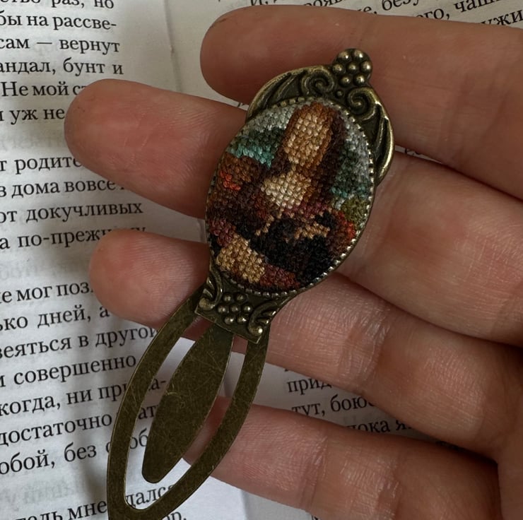 This unique metal bookmark features a miniature hand-embroidered cross-stitch artwork inspired by a classic painting. Each stitch is carefully made by hand, creating a tiny, detailed masterpiece set into an antique-style bronze metal base.