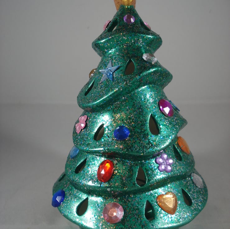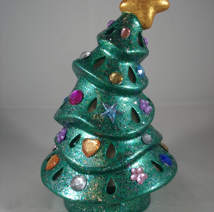 I have for sale a ceramic Christmas candle/tealight holder, which was hand painted by myself. It is a cute, green wonky looking Christmas tree, which is glittery and decorated with small coloured gems. It stands on a green, glittery base, which is completely separate and holds the candle. Included in the sale, is a free battery operated flickering tealight candle. This would make a lovely addition to anyone's Christmas decorations, or perhaps given as a gift.