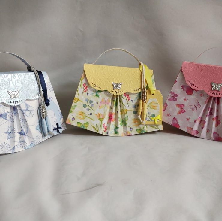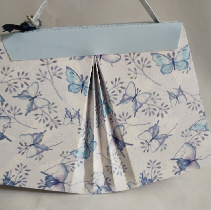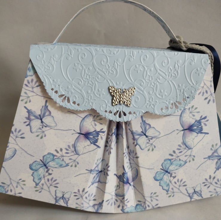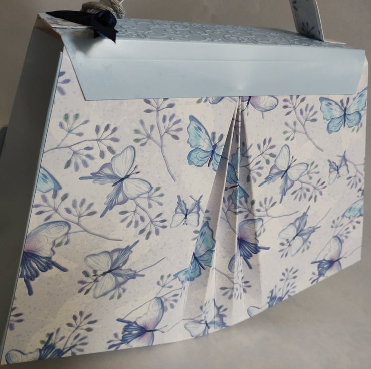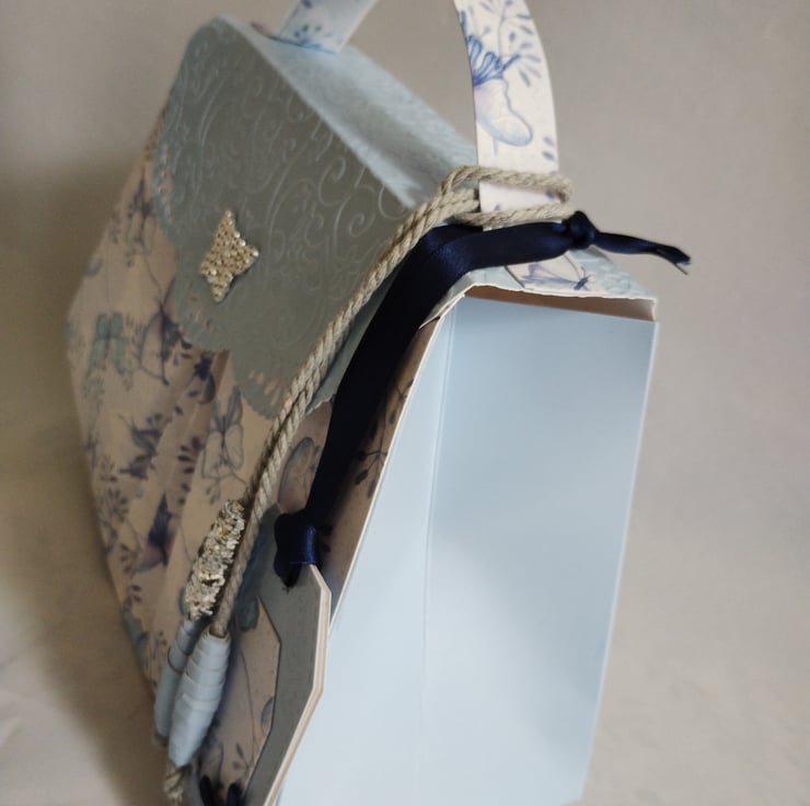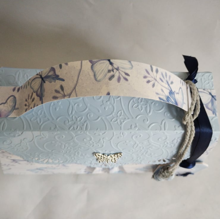 I've made this gift box bag from premium white/blue and butterfly patterned cardstock and premium baby blue finish cardstock to the front fold, flap and sides. Made in my unique fanfold design to the front and back and featuring a beautiful diamante butterfly as a faux clasp to the front flap which is embossed in a beautiful floral design; this will make any gift extra special. Decorated with matching paper beads, tied with thick silver grey twine, and complete with co-ordinating tags, tied with navy blue satin ribbon, for you to write your message.