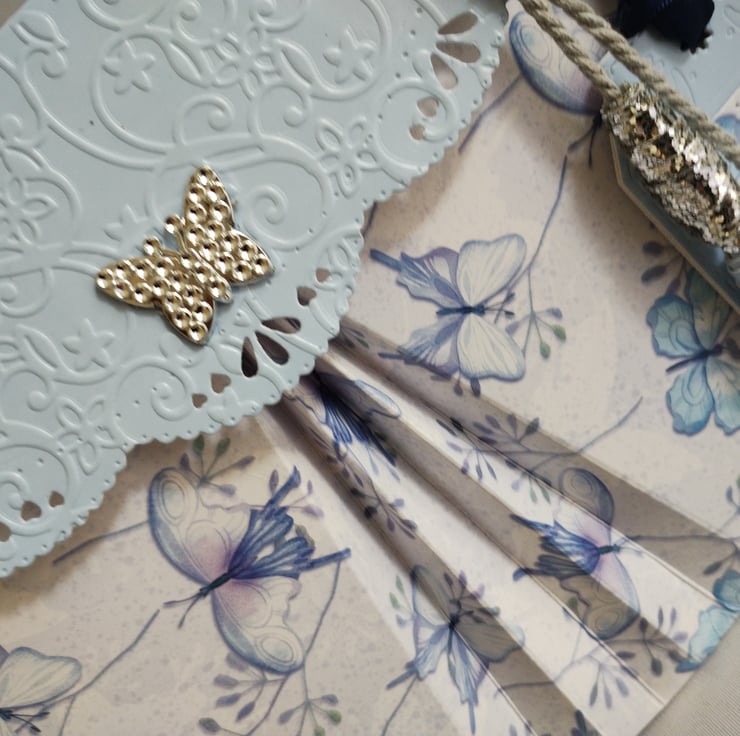 Make your gift giving exceptional with this handmade exquisite blue butterfly pattern unique fanfold detail gift box complete with matching gift tag.