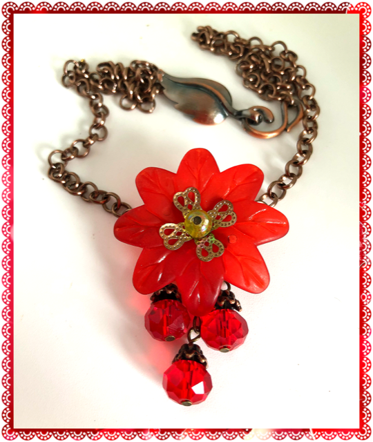 Created using this Red Lucite flower with red faceted rondels, copper bead caps. Copper findings-copper chain finished with a stylish copper leaf clasp. Necklace measures approx 20”/51 cm nickel free.