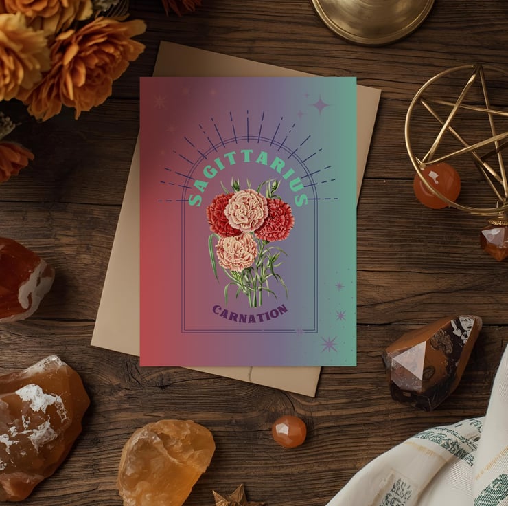 This Sagittarius (Nov 22 – Dec 21) card features the Carnation, a flower of admiration and adventure. Inspired by vintage botanical drawings, the design layers delicate hand-drawn detail with a modern gradient wash. A vibrant zodiac birthday card for the free-spirited Sagittarius.