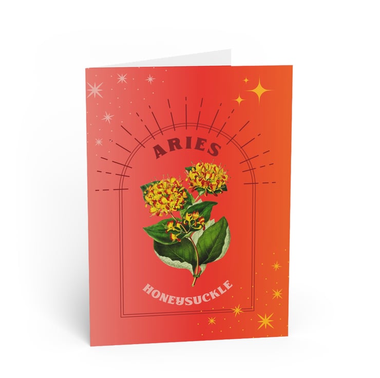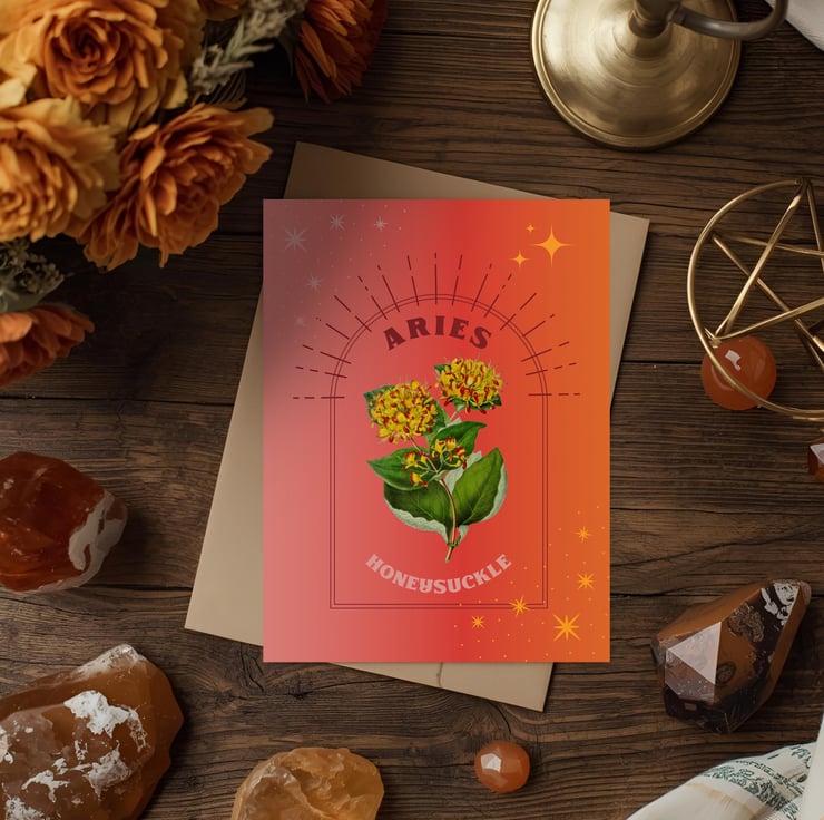 Mark the fiery personality of Aries (Mar 21 – Apr 19) with this antique botanical Honeysuckle drawing and reimagined with a modern gradient wash, it combines hand-coloured details with digital layering. A striking astrology card that celebrates Aries’ devotion and adventurous spirit.