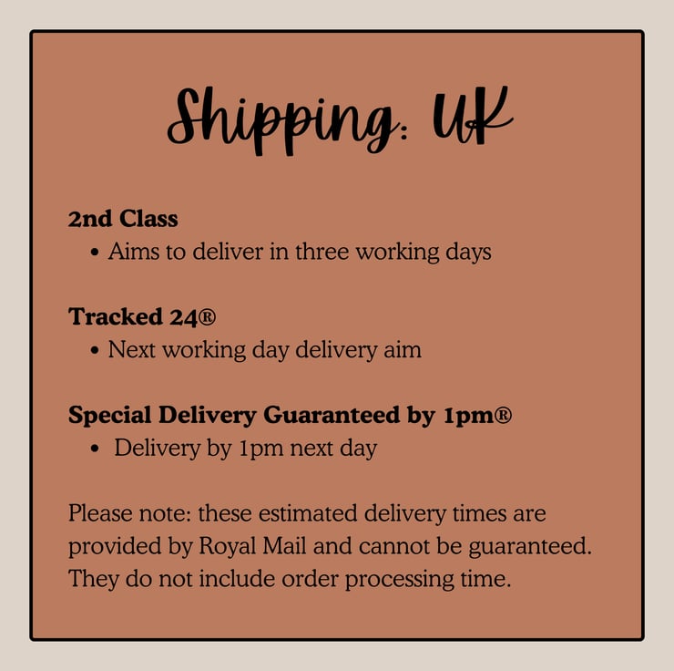 Please note that delivery dates provided by Etsy and Royal Mail are estimates and are not guaranteed.